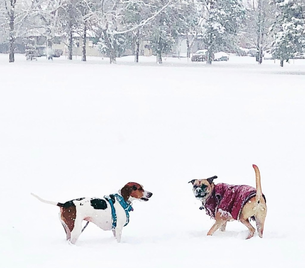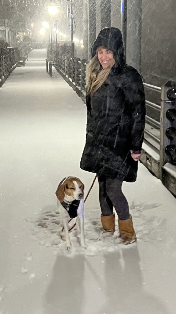 I felt like a kid again anticipating the first snowflake and remembering that excitement in my parents’ living room, waiting and waiting. And then there it was! Just like when I was little. It was pure magic watching the snow fall from our kitchen window as my son and I whipped up some homemade chicken noodle soup. I dug out my dusty old boots and my big heavy puffer jacket and grabbed the dogs for an evening stroll through the neighborhood. Much to my surprise, my little Finnie girl was not impressed.