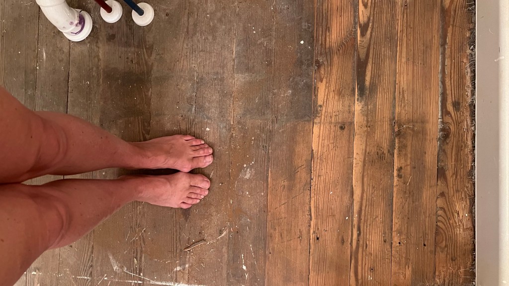 Now that the closet and the bathroom build out is complete, it is time to strip the rest of the floors. Renting a sander wasn’t a viable option because the floor boards are nailed in individually so it will need to be done by hand. With the help of a stripper, my handy sander and many talks with my dad and my friend, Kody encouraging me and guiding me from afar, I got to work.