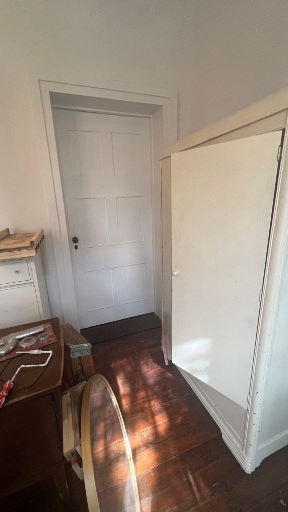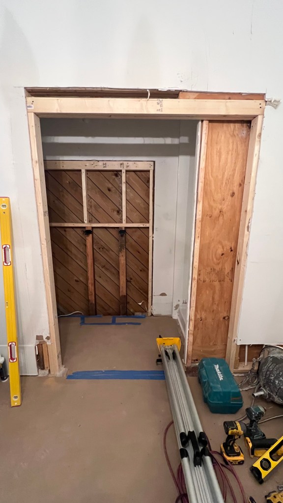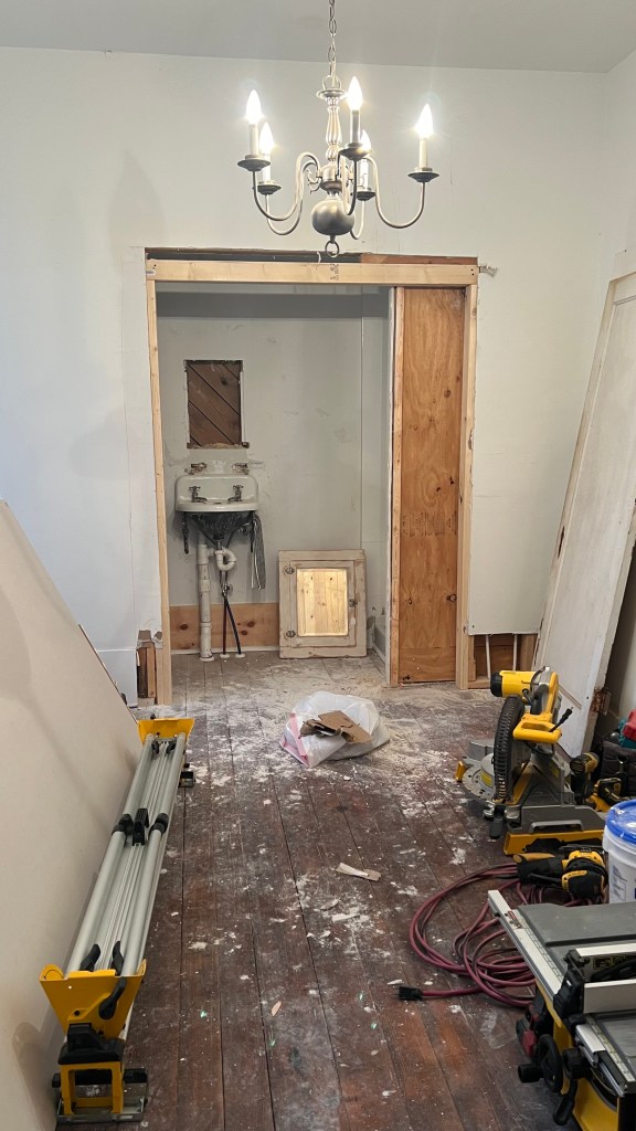 I have always loved discovering a secret pocket door hidden behind a wall. Adding a pocket door to the bathroom seemed like a tedious process, so I left this one for my contractor to handle. My neighbor gifted me an old vintage door, which I happily accepted. I gave it a little sprucing up and handed it to Dallas for the pocket door project.