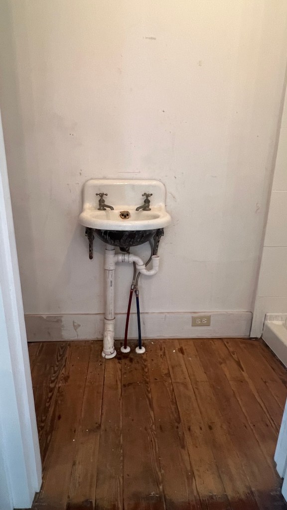 You may have seen, the post about the bathroom renovation which took over three months to complete. I hired a plumber to install a new toilet and sink after we moved the washer and dryer to the basement. There was just enough space for a toilet and my cast iron sink that I had been holding on to for several years. It was the perfect space for the sink. The plumbing was eventually moved behind the walls after my contractor found a plumber who was good with adding finishing touches.