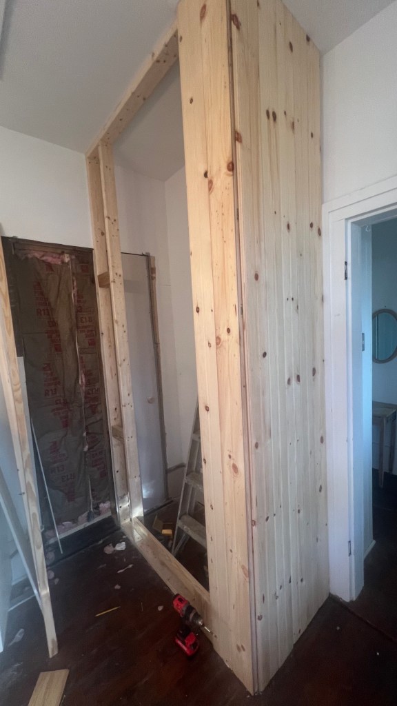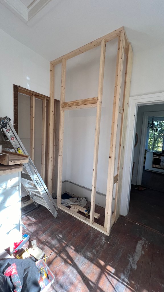 Once the framing had been started I came up with a great design trick to use the extra space from the doorway as a built in bookshelf. Utilizing all the extra space in this room was key.