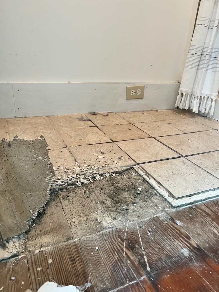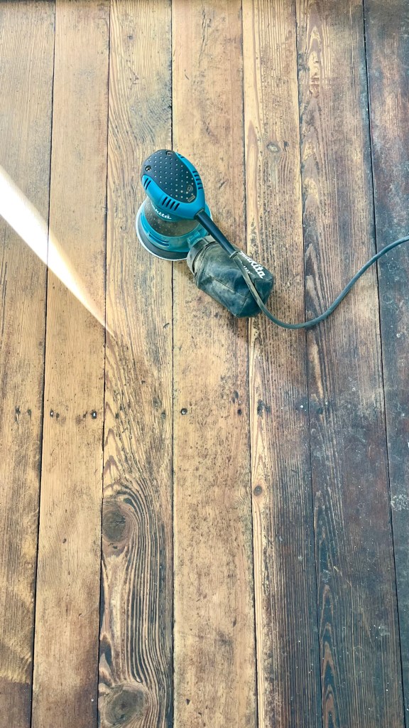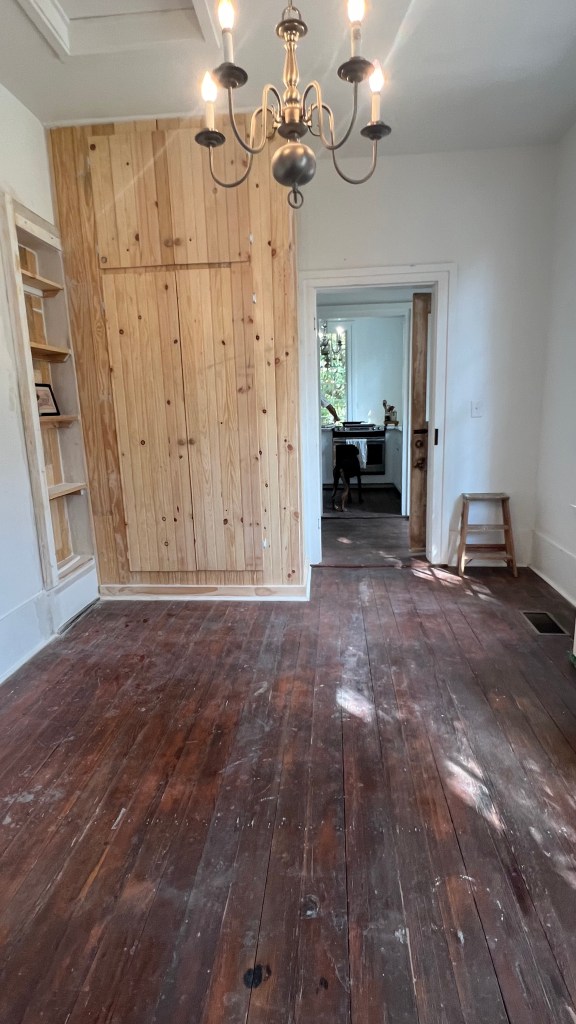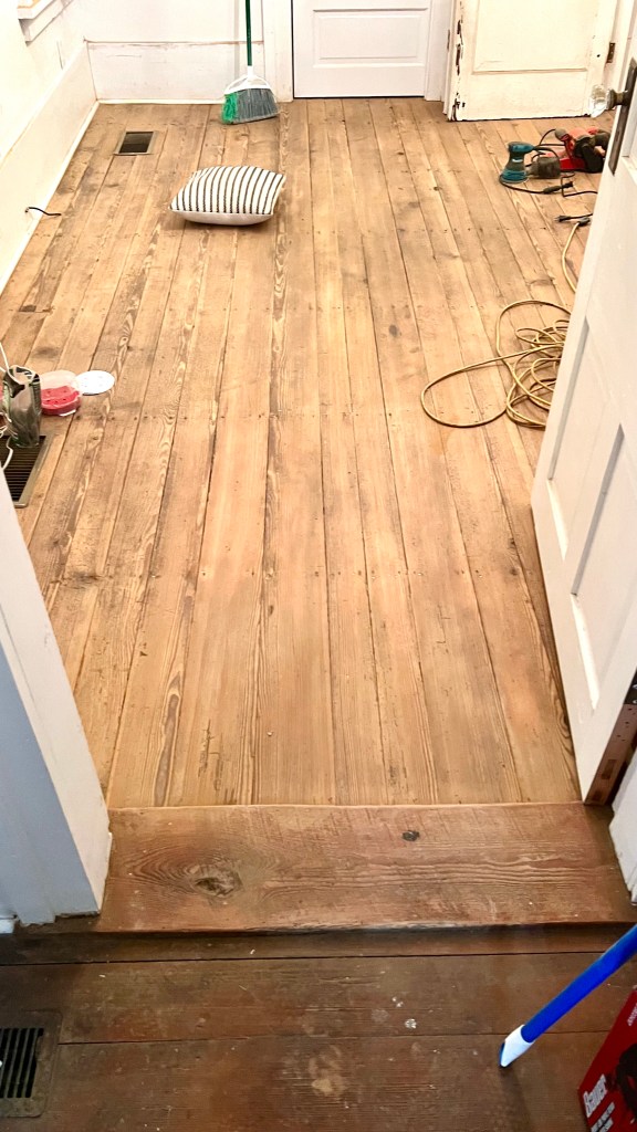 After removing the tiles, I started the process of stripping the wood floors so I could reveal their natural beauty. They were covered in a dark/orange stain which not only made the space too dark but it didn’t show any of the raw character of the wood. Can you believe these floors are almost 200 years old? That’s a big reason I am a huge advocate for using sustainable products. This is what will last for many more years to come. No LVP in this house!