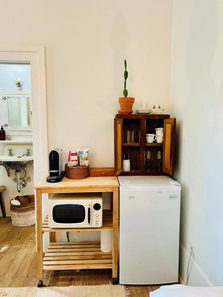 I added a vintage microwave cart and a mini fridge I bought from a friend, which was perfect for the coffee station. I splurged on a Nespresso coffee machine and found the cutest retro microwave.