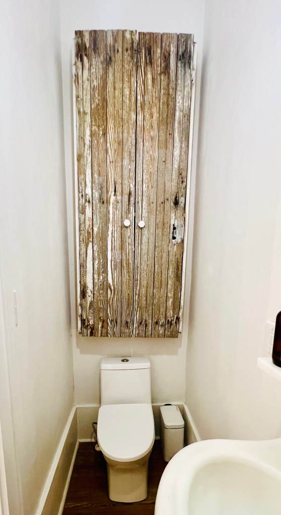 My handyman cut the barn door into two pieces, added hinges and knobs. Now I can store all the toilet paper I need for my guests!
